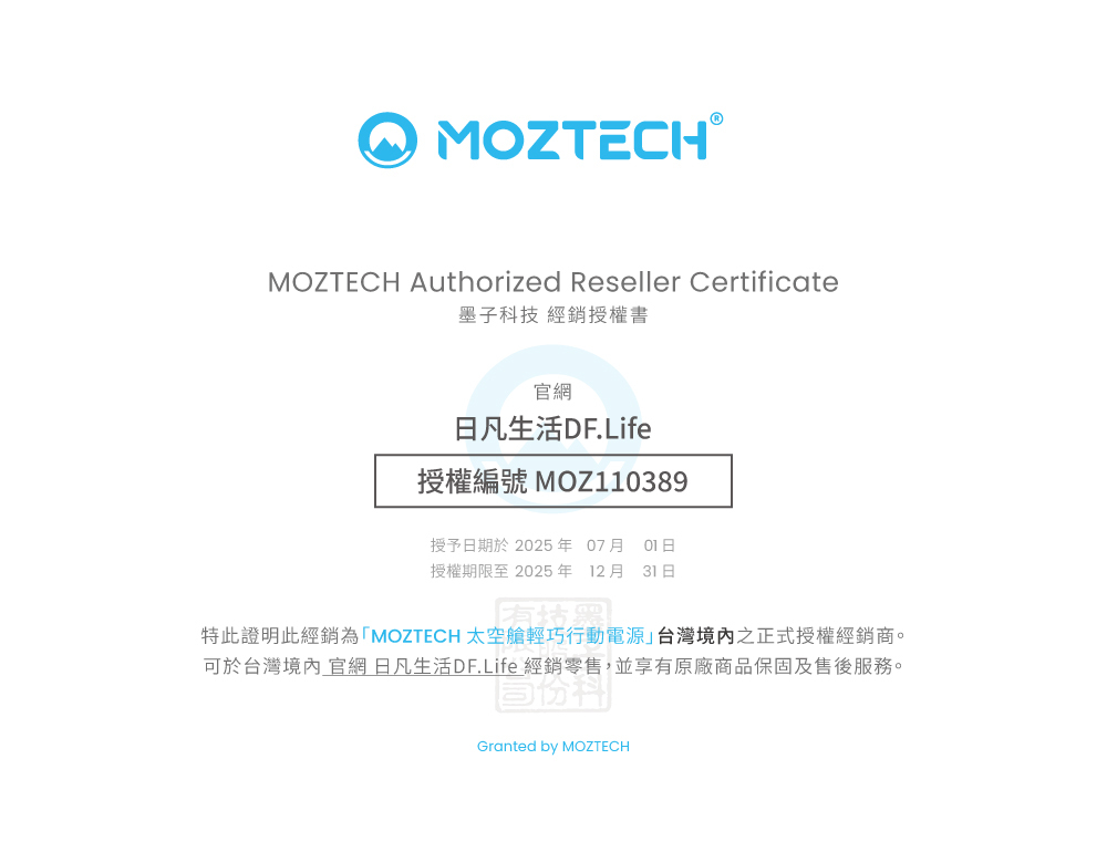 1. 為了確保客戶權利,請保留產品保固卡或購買證明文件(須包含日期、品項)等,請勿將保固卡、購買文件的日期除去、塗毀導致無法正確辨識,若有該狀況 MOZTECH 將以產品出廠日期作為保固起始日期。